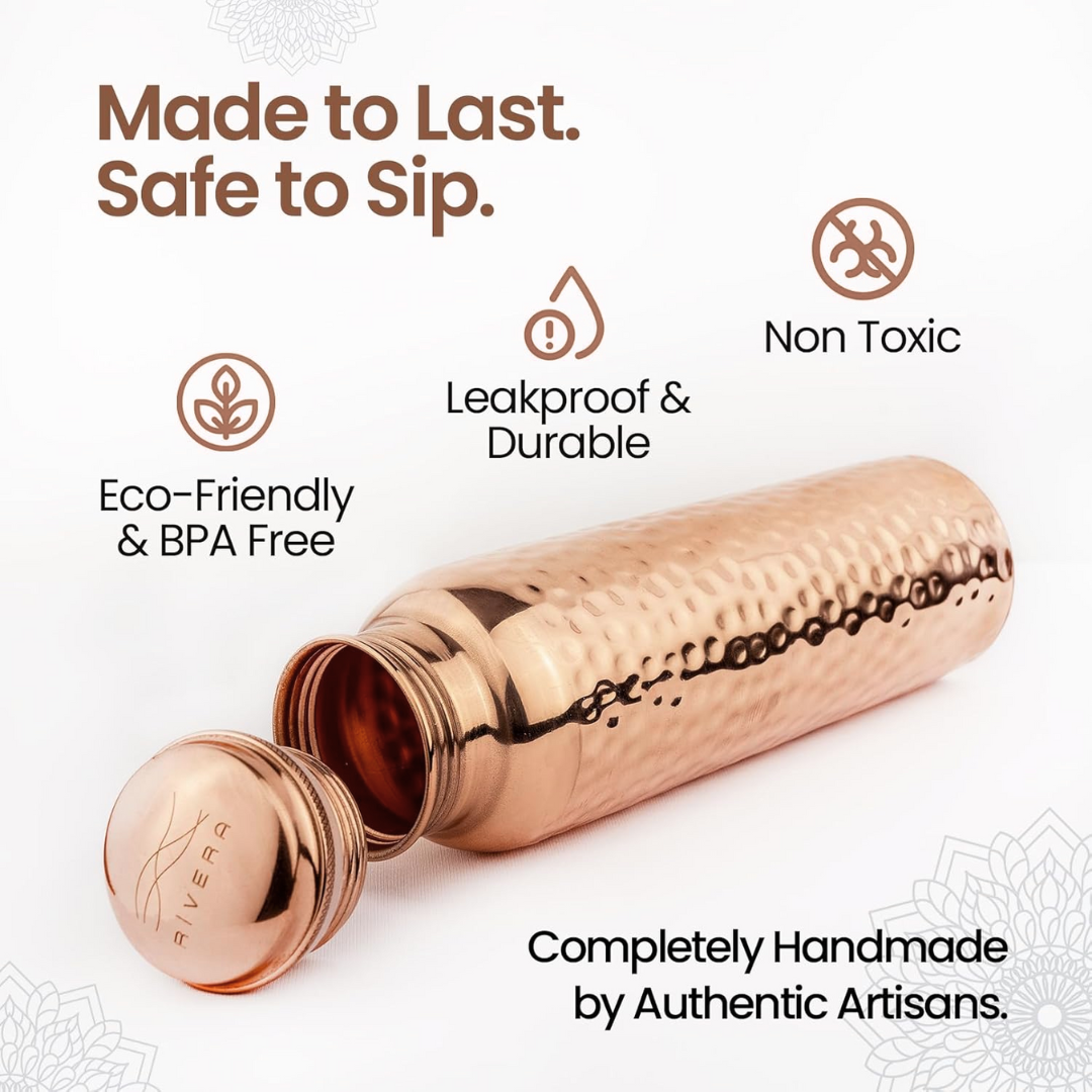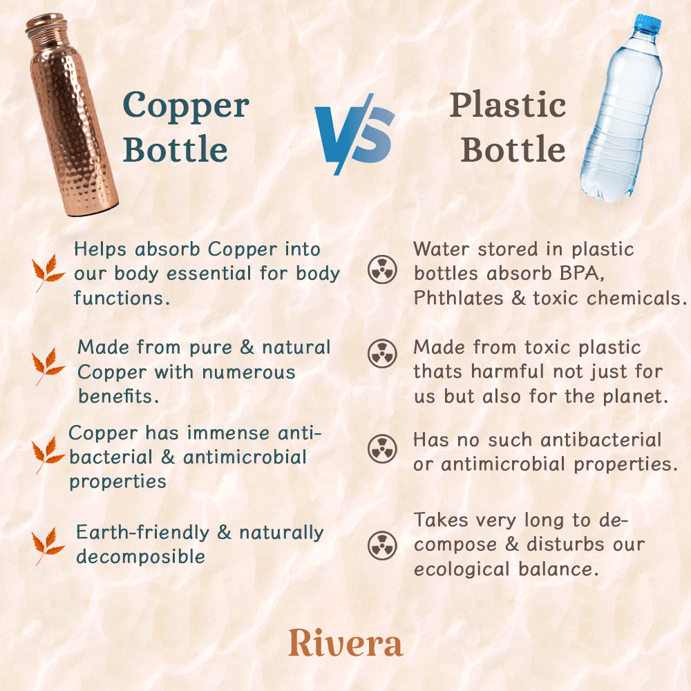 Plastic is easy and costly. It leaches toxins, clutters the earth, and offers nothing back. Rivera’s copper bottle? It purifies your water, balances your body, and honors 3,000 years of Ayurvedic wisdom.